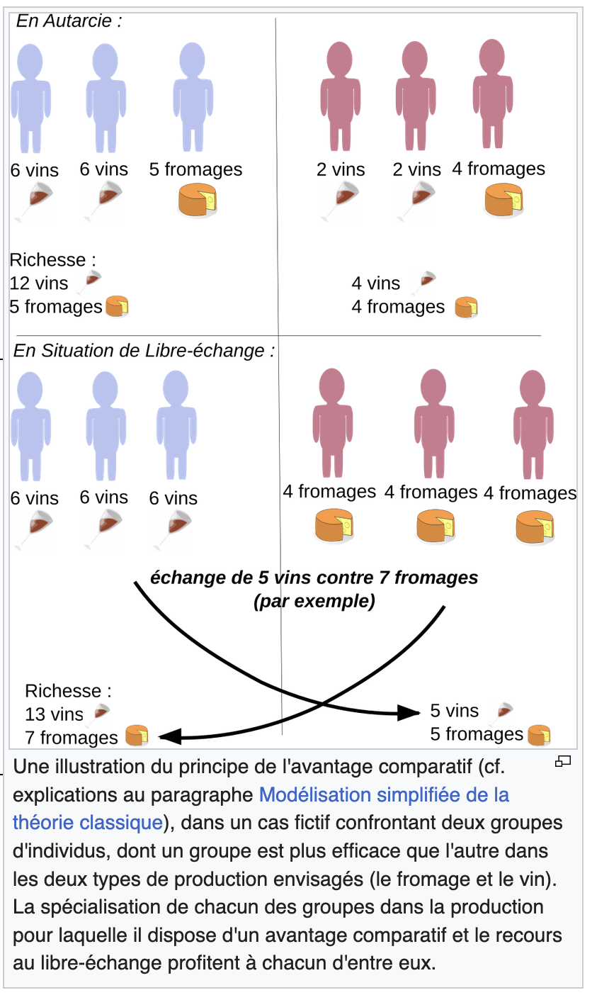 Here’s the idea. In economy, it is not advantageous to produce everything yourself, because we all have different talents and resources. If we remove economic barriers and we adopt free trade, each group can focus its production around their specialty and import goods for others' surpluses. In the end, this will not make everyone more equal, but it will make everyone richer than they were before putting free trade in place.