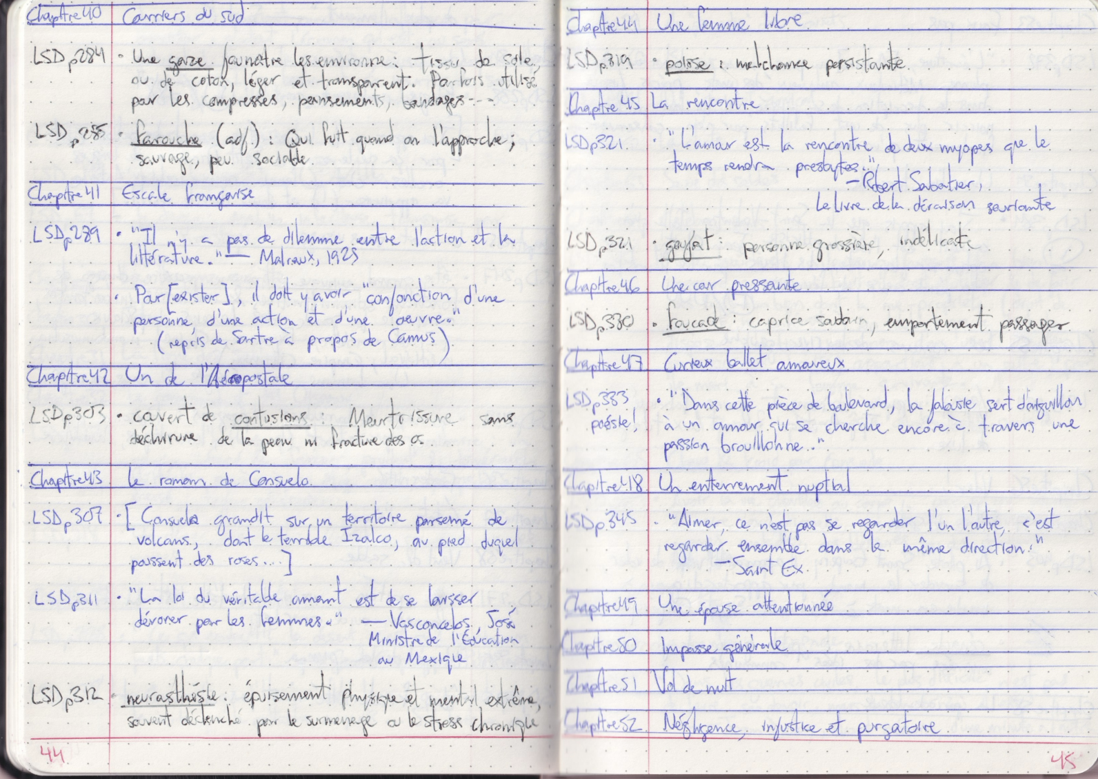 - (p. 372) “L’écriture, [Antoine] y pense, mais en laborieux de la plume. Méticuleux, amoureux des mots, précis jusque dans la description de sa pensée, il lui faut parfois noircir plus de cent feuillets pour n’en conserver finalement qu’un seul.